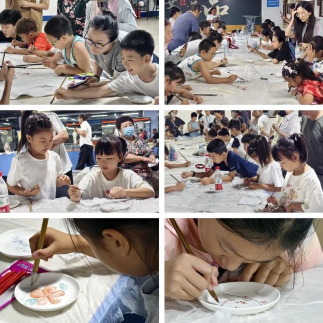 知識浸潤心田,創(chuàng)意亟待揮灑。畫陶瓷盤活動(dòng)瞬間點(diǎn)燃全場熱情,孩子們化身“小小藝術(shù)家”,手持畫筆,俯身于素白瓷盤之上,青花筆觸勾勒想象,斑斕色彩躍然盤間。稚嫩筆鋒繪就的花鳥、童趣盎然的圖案,甚至天馬行空的抽象創(chuàng)作,每一筆都是童心與古韻的奇妙碰撞。家長或輕聲指點(diǎn),或共同創(chuàng)作,親子協(xié)作暖意融融。一件件獨(dú)一無二的“藝術(shù)品”在歡聲笑語中誕生,承載著親子間的溫暖記憶。一瓷一世界,一筆一童心,讓文化傳承在親子共繪中綻放新芽。